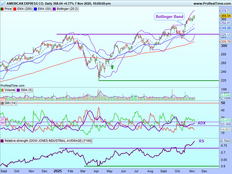 Graficul zilnic al American Express arată că prețurile se află într-un raliu de la minimul din luna aprilie 2025 şi au trecut peste un nivel de rezistență cheie constituit din maximele anterioare (de culoare violet), de la circa 326$. Odată cu raliul, prețurile au format mai multe bule ascendente a BB. Prețurile au format o nouă bulă spre sfârșitul lui octombrie care încă este dechisă. Să remarcăm faptul că media mobilă pe 50 zile a trecut din nou peste cea pe 200 zile încă de la începutul lui mai 2025. Prețurile se tranzacționează deasupra mediilor mobile pe 50 și 200 zile, ceea ce este ”bullish”.