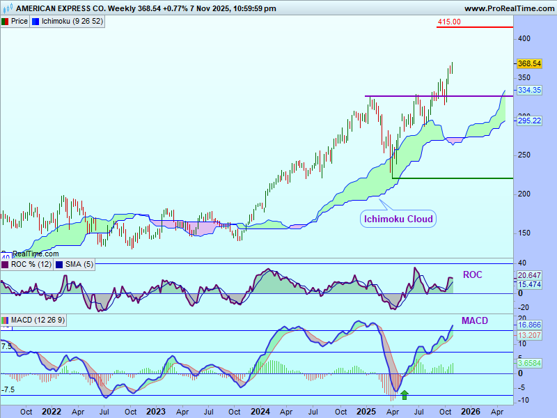 De la minimul din luna aprilie 2025, prețurile acțiunii American Express au crescut de la un nivel de suport situat deasupra norului Ichimoku, nivel situat la circa 220$. Ele au ieşit deasupra norului în aprilie 2025 şi de atunci se mișcă deasupra norului atingând noi maxime istorice. Semnalul este convingător, cum norul deplasat înainte este colorat în verde.