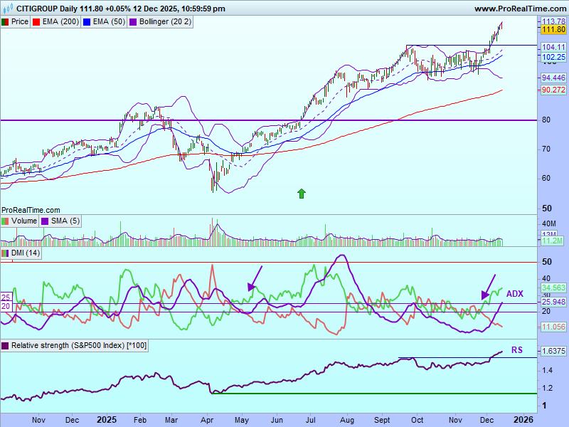 Sistemul de indicatori DMI - Directional Movement Index a susținut creșterea prețurilor acțiunii Citigroup (a se vedea panoul din mijloc). Indicatorii direcționali au trimis ultimul semnal la sfârşitul lui noiembrie 2025, ce arată o direcție ascendentă a prețului acțiunii, pe măsură ce +DI (linia verde) s-a intersectat și a trecut din nou deasupra –DI (linia roșie). Linia ADX (linia violet) ne spune dacă prețul acțiunii se confruntă cu un trend puternic (peste valoarea de 25). Ultimul mini-raliu este destul de puternic, întrucât linia ADX depășește acum nivelul 25.