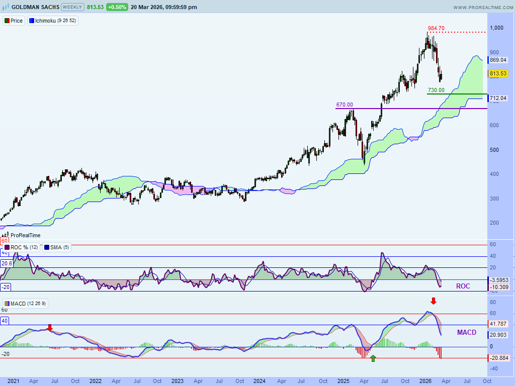 Graficul săptămânal arată că de la maximele din ian. 2026, prețurile acțiunii Goldman Sachs au scăzut de la un nivel de rezistență situat deasupra norului Ichimoku, nivel situat la circa 985$. Prețurile se îndreaptă acum spre marginea superioară a norului. Mișcarea descendentă trebuie confirmată, întrucât norul deplasat înainte încă nu s-a schimbat și este colorat în verde.