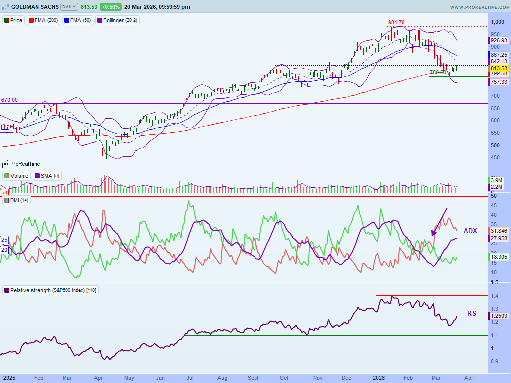 Sistemul de indicatori DMI - Directional Movement Index a susținut corecția prețurilor acțiunii Goldman Sachs (a se vedea panoul din mijloc). Indicatorii direcționali au trimis un semnal la sfârșitul lunii feb. 2026, ce arată o direcție descendentă a prețului acțiunii pe măsură ce +DI (linia verde) s-a intersectat și a trecut sub –DI (linia roșie). Linia ADX (linia violet) ne spune dacă prețul acțiunii se confruntă cu un trend puternic (peste valoarea de 25). Corecția este una destul de puternică, întrucât linia ADX se îndreaptă spre nivelul 30.