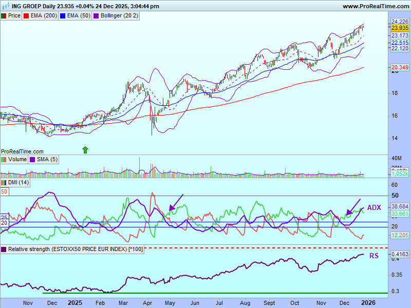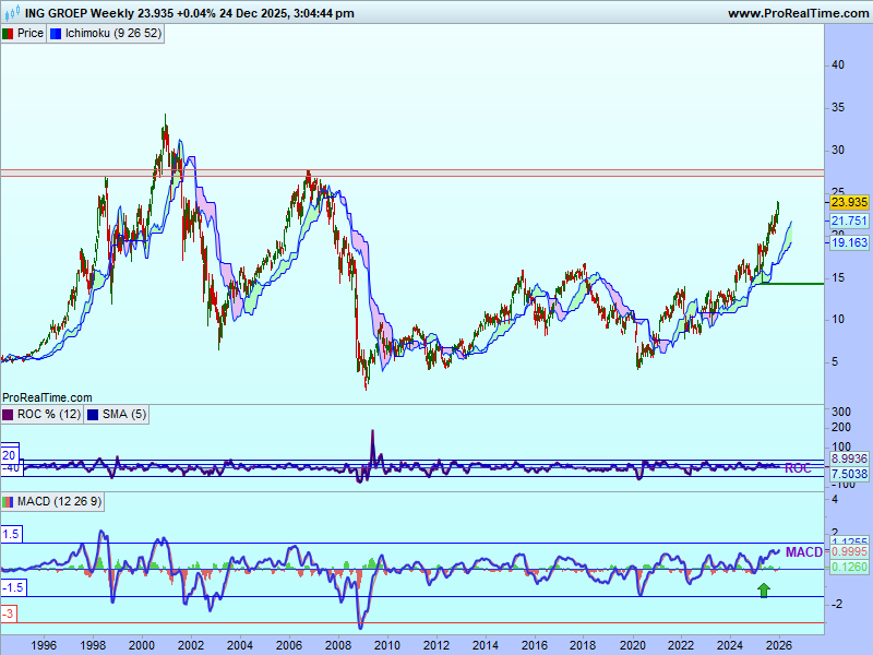 Graficul săptămȃnal arată că, de la minimul din aprilie 2025, prețurile acțiunii ING au crescut de la un nivel de suport situat la marginea inferioară a norului Ichimoku, nivel situat un pic deasupra lui 14€. Prețurile au ieșit deasupra norului la mijlocul lunii aprilie 2025. Prețurile se află într-un trend ascendent deasupra norului și se îndreaptă spre maximele de dinainte de criza financiară din 2007-2008. Semnalul este convingător, cum norul deplasat înainte este colorat în verde.
