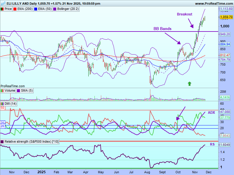 Graficul zilnic al Eli Lilly arată că prețurile se află într-un raliu de la minimele din luna august 2025 şi au trecut peste un nivel de rezistență constituit din maximele anterioare (de culoare violet), de la peste 960$. Odată cu începutul lui octombrie 2025, prețurile au deschis o bulă ascendentă a BB care s-a închis spre sfârșitul lui octombrie. Prețurile au format o nouă bulă ascendentă odată cu începutul lunii noiembrie 2025 care este încă dechisă. Să remarcăm faptul că media mobilă pe 50 zile a trecut din nou peste cea pe 200 zile la sfârșitul lui octombrie 2025. Prețurile se tranzacționează deasupra mediilor mobile pe 50 și 200 zile, ceea ce este ”bullish”.