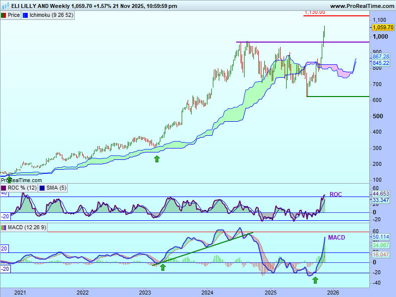 De la minimele de la începutul lui august 2025, prețurile acțiunii Eli Lilly au crescut de la un nivel de suport situat sub norul Ichimoku, nivel situat la circa 620$. Ele au ieșit definitiv deasupra norului la sfârșitul lui octombrie 2025. De atunci prețurile se află într-o mișcare ascendentă deasupra norului. Semnalul este convingător, pe măsură ce norul deplasat înainte s-a schimbat și este colorat în verde.