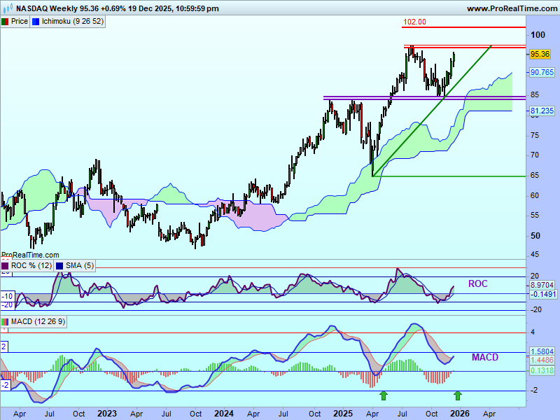 Graficul săptămȃnal arată că, de la minimul din aprilie 2025, prețurile acțiunii Nasdaq au crescut de la un nivel de suport situat în interiorul norului Ichimoku, nivel situat la circa 65$. Prețurile se află într-un trend ascendent deasupra norului. Semnalul este convingător, cum norul deplasat înainte este colorat în verde.