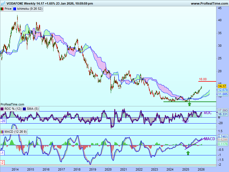De la minimele din ianuarie-aprilie 2025, prețurile (ADR) ale acțiunii Vodafone au crescut de la un nivel de suport situat sub norul Ichimoku, nivel situat la circa 8$. Ele au ieșit deasupra norului în luna mai 2025, confirmând schimbarea trendului descendent anterior. De atunci prețurile se află într-un trend ascendent deasupra norului. Semnalul este convingător, cum norul deplasat înainte s-a schimbat și este colorat în verde.