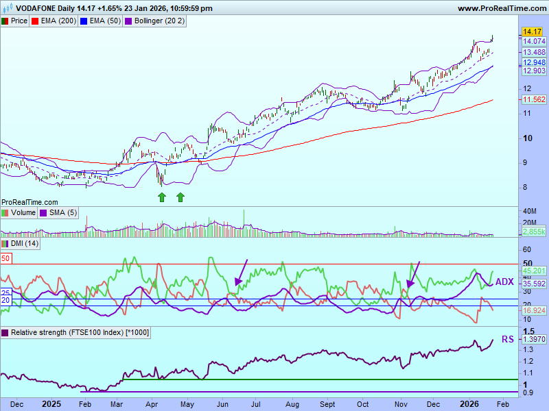 Graficul zilnic al Vodafone arată că prețurile (ADR) se află într-un raliu de la minimele din aprilie 2025 și înregistreaza noi maxime anuale. Odată cu începutul raliului, prețurile au format mai multe bule ascendente, care le-au dus peste 14$. Prețurile au deschis o nouă bulă ascendentă în noiembrie 2025, care se continuă și în luna ianuarie 2026. Să remarcăm faptul că media mobilă pe 50 zile a trecut peste cea pe 200 zile în luna aprilie 2025. Prețurile se tranzacționează deasupra mediilor mobile pe 50 și 200 zile, ceea ce este ”bullish”.