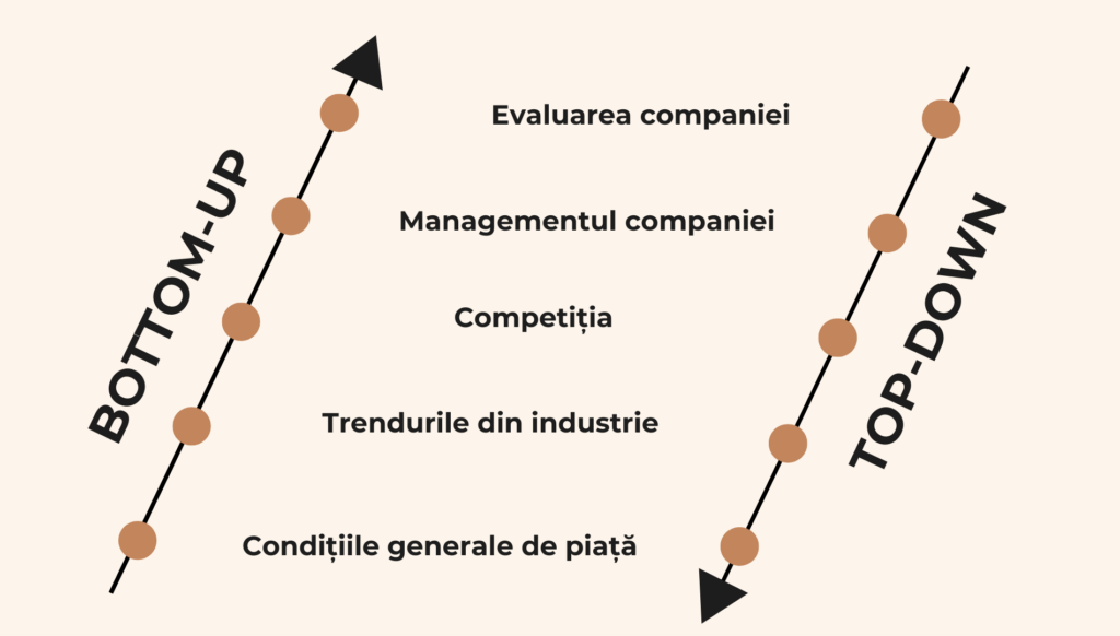 Strategia top-down se concentrează pe evaluarea contextului economic și de piață în ansamblu, cu scopul de a identifica posibile oportunități de investiții. Această metodă implică analiza factorilor macroeconomici și a direcțiilor în care se îndreaptă piața, în vederea identificării sectoarelor cu potențial de performanță excelentă cu scopul de a identifica, mai apoi, acțiuni specifice din aceste sectoare care pot fi subiectul investițiilor. Pașii strategiei top-down:- Analiza condițiilor generale de piață