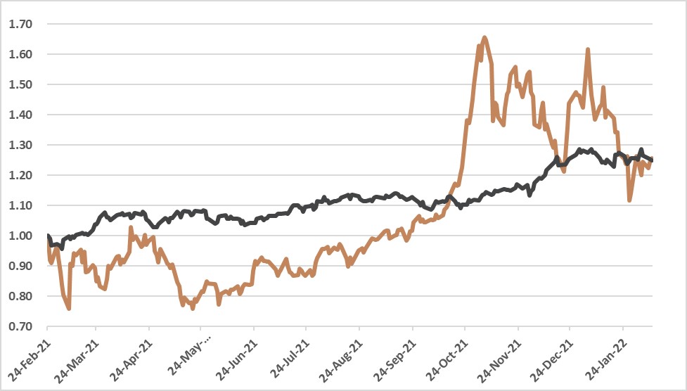 Indicele beta este cel care dă măsura volatilității relative a unei acțiuni. Acesta este cel care calculează volatilitatea randamentelor unei acțiuni față de randamentul unui indicator de referință. Așadar, acesta este esențial când vine vorba de deciziile investiționale. Volatilitatea este utilizată pentru a estima randamentele viitoare, acestea implicând atât pierderile, cât și câștigurile. Măsura de protecție împotriva volatilității este diversificarea, ca în cazul multor altor riscuri investiționale. În graficul de mai jos se poate observa un exemplu real care prezintă evoluția a două companii în decursul unui an de zile (aproximativ: 24 feb 2021 – 9 feb 2022). Acțiunea mai puțin volatilă are în prezent un beta de 0,44, în timp ce compania volatilă are un beta de 2,05. Așadar, au fost luate în considerare două acțiuni aflate la extreme opuse din punctul de vedere al volatilității față de piață (o acțiune cu o volatilitate similară cu cea a pieței are un beta egal cu 1).
