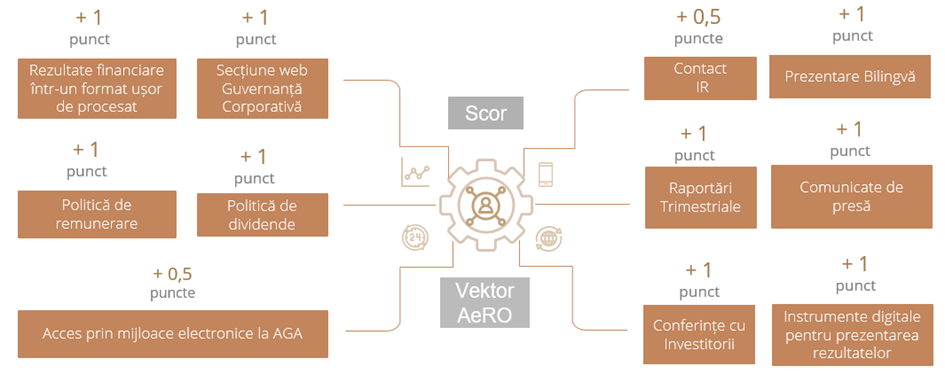 Inaugurarea indicelui bursier BET-AeRo marchează primul pas înspre colaționarea așteptărilor investitorilor cu dinamica și evoluția celor mai lichide companii de pe segmentul SMT al Bursei de Valori București. Creionarea unui indicator care să măsoare calitatea relației cu investitorii pentru companiile din structura noului indice BET-AeRo pare un următor pas firesc. Evaluarea și acordarea unui scor relației cu investitorii ar putea fi elementul catalizator pentru companiile listate în promovarea unor politici interne care să asigure transparența activității și un flux informațional susținut cu acționarii. Marcând un moment pivot pentru conduita emitenților într-o piață mai puțin reglementată, ARIR vine în întâmpinarea noilor tendințe cu o propunere de evaluare a relației cu investitorii susținute de către companiile din indicele BET AeRo. Pornind de la metodologia VEKTOR pentru Piața Reglementată, scorul VEKTOR AeRO pentru anul 2022 are în vedere 11 criterii cu focus pe promovarea practicilor proactive în relația cu investitorii.