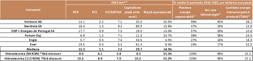 Conform intervalului din ofertă (fără a include și discountul oferit investitorilor de retail), compania este evaluată la un raport PER cuprins între 8,6 și 10,3. Ambele valori se află sub mediana de 15,3 a unor companii importante din domeniul producției de energie regenerabilă și care produc o cantitate semnificativă de energie hidro.