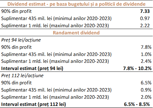 Nu este străin faptul că politica de dividende a Hidroelectrica ar putea fi una generoasă. Minim 90% din profitul net, dar și dividendele suplimentare sunt informațiile care susțin această ipoteză și care au ajutat Hidroelectrica să distribuie în ultimii ani dividende semnificative, de multe ori de peste 100% din profitul net al anului anterior. Deși performanța financiară a acestui an, dar mai ales cea pe termen lung, este dificil de anticipat cu exactitate, propunem să plecăm de la un scenariu de bază, respectiv cel al profitului net bugetat de companie - de 3,66 miliarde de lei, unul care, cel puțin până acum, pare realizabil în contextul în care în primele trei luni ale anului profitul net s-a ridicat la 1,7 mld. lei, iar, așa cum am văzut mai sus, producția energiei ar putea depăși media ultimilor ani și ar putea compensa ușor din perspectivele unor prețuri mai mici ale energiei. În același timp, am prezentat și două scenarii bazate pe dividendele suplimentare plătite de către companie, luând cel mai ridicat, respectiv cel mai scăzut nivel al anilor 2020-2023. Așadar, plecând de la profitul bugetat, calculele pentru dividendul ce ar putea fi plătit de companie, respectiv randamentele estimate pentru anul 2024 sunt următoarele, divizate pe scenarii: