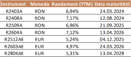 Cu siguranță nu toată lumea este confortabilă cu investițiile în acțiuni, chiar dacă au ales să investească în Hidroelectrica. În acest caz, titlurile de stat pot reprezenta o alternativă potrivită la acestea. Cu risc mai redus și cu o inflație care este așteptată să scadă până spre nivelul de 4,2% la final de 2024 (conform BNR), dobânzile oferite de către stat au atras un interes ridicat din partea investitorilor în ultimul timp. Ca argument în sprijinul acestei idei, putem menționa oferta Fidelis din luna aprilie, care a atras investiții de peste 3 mld. lei. Această ofertă reprezintă o dovadă concretă a interesului investitorilor în alocarea capitalului în oportunități de investiții pe piața de valori. Mai jos regăsiți câteva emisiuni de titluri de stat listate la bursă și dobânzile acestora: